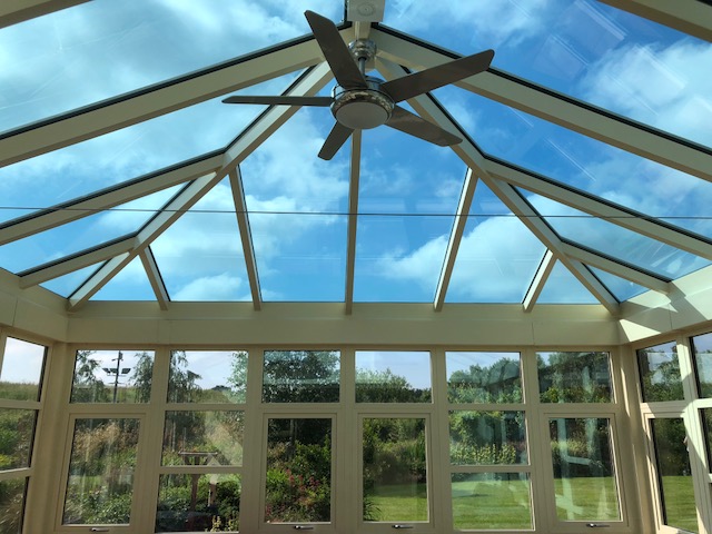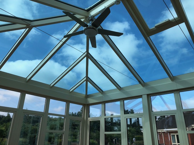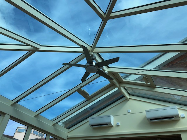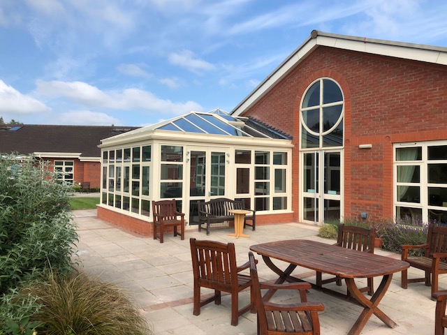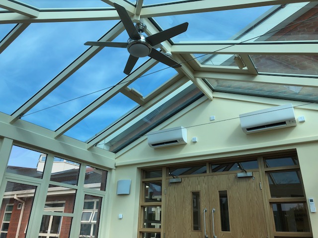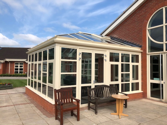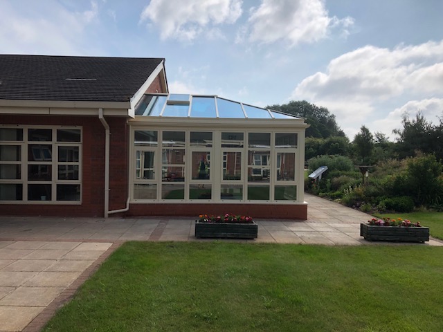 A conservatory we recently completed at Severn Hospice in Shrewsbury. Built in fully thermally broken aluminium, coloured in a relaxing Ral 1015 light ivory. The roof has two electrically operated vents for natural ventilation, utilizing temperature and rain sensors for fully automatic or manual operation. The large area of glazing on three sides give panoramic views of the beautiful garden area. The double doors give nice easy access in and out of the building.