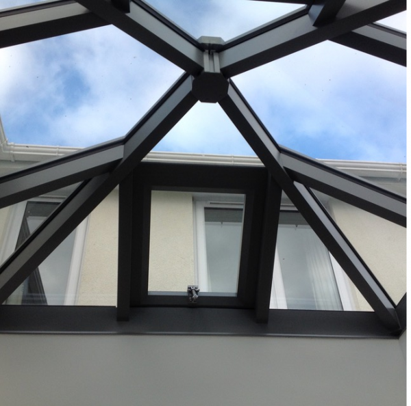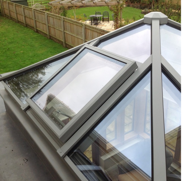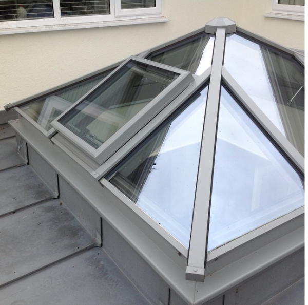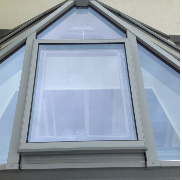This mono colour pyramid rooflight was supplied by Howells in Grey RAL and incorporared 2 opening vents