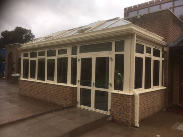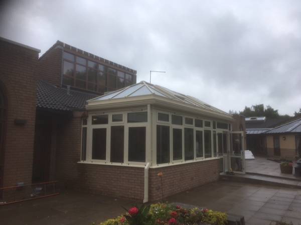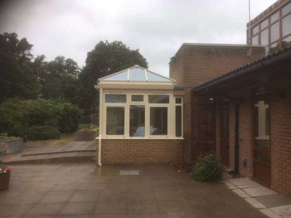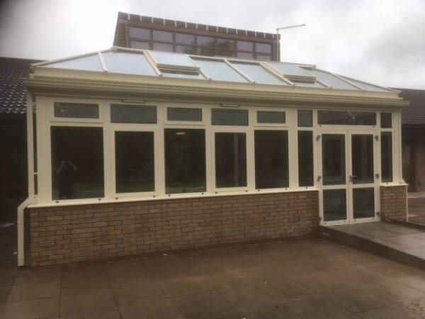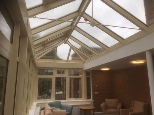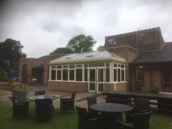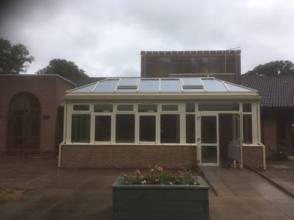 A conservatory we completed at Severn Hospice in Shrewsbury. Built in fully thermally broken aluminium, coloured in a relaxing Ral 1015 light ivory. The roof has two electrically operated vents for natural ventilation, utilizing temperature and rain sensors for fully automatic or manual operation. The large area of glazing on three sides give panoramic views of the beautiful garden area. The double doors give nice easy access in and out of the building.